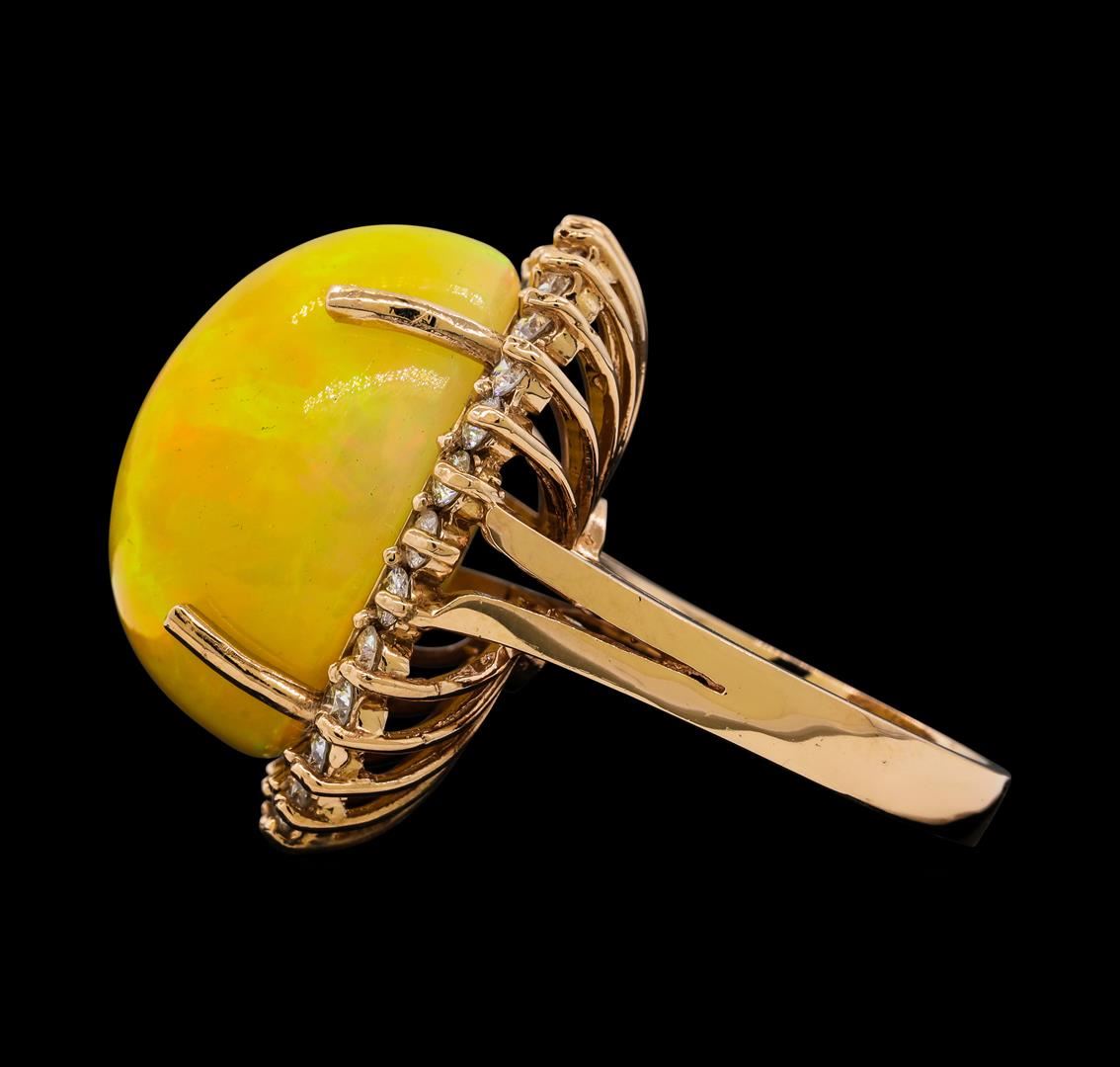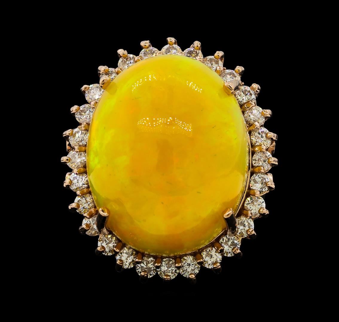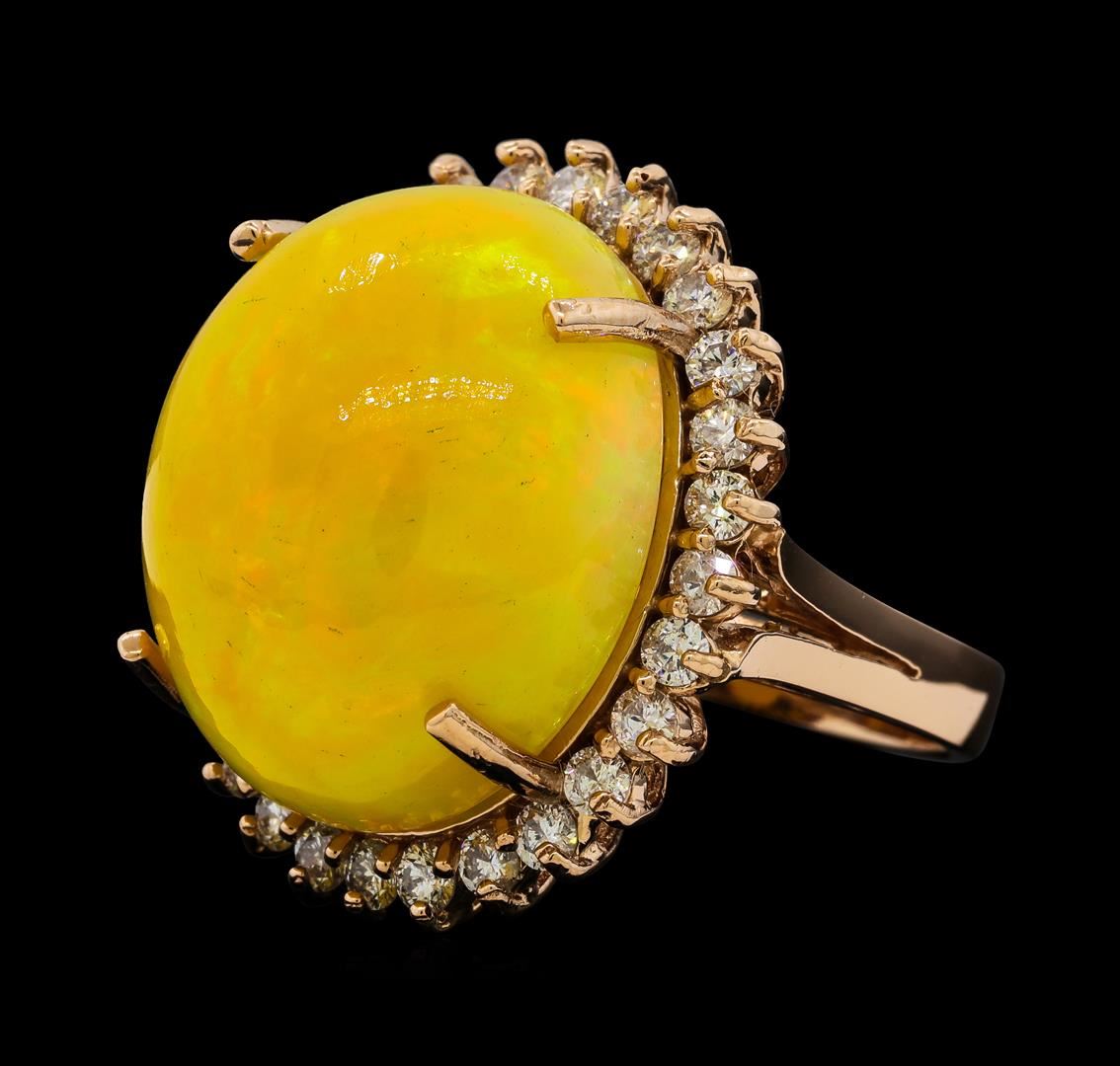 One electronically tested 14KT rose gold lady's cast fashion ring with a split shank basket halo with a bright polish finish. The featured lady's ring has a shank measuring 3.21 millimeters wide. Identified with markings of 'K14'. Condition is new, good workmanship. Containing: One orange crystal that is cut in a oval shaped cabochon and is prong set, measuring 21.81 mm long x 17.33 mm wide, and 13.50 mm thick and the approximate weight is 25.28 carats. The opal has a somewhat bright, orange-red play of color (fire) in a rolling flashfire pattern; a high dome; a good cut; no inclusions; slight variation in base in its brightness and pattern; and is not directional. Graded in the setting. Twenty-Eight prong set round brilliant cut diamonds, measuring 2.40 - 2.35 x 1.43mm (depth est.) approximate total weight of 28 Stones = 1.38ct. Graded in the setting. Clarity SI-1 to SI-2. Color: G - H Cut Good. Total Weight of Diamonds 1.38ct.. Total Weight of Opals 25.28ct.. Total Weight of Ring 14.90gm. GAS Appraised at $10,545.00.