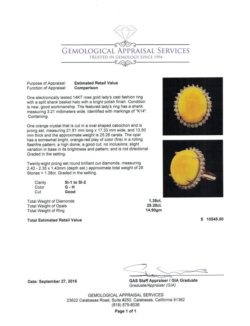 One electronically tested 14KT rose gold lady's cast fashion ring with a split shank basket halo with a bright polish finish. The featured lady's ring has a shank measuring 3.21 millimeters wide. Identified with markings of 'K14'. Condition is new, good workmanship. Containing: One orange crystal that is cut in a oval shaped cabochon and is prong set, measuring 21.81 mm long x 17.33 mm wide, and 13.50 mm thick and the approximate weight is 25.28 carats. The opal has a somewhat bright, orange-red play of color (fire) in a rolling flashfire pattern; a high dome; a good cut; no inclusions; slight variation in base in its brightness and pattern; and is not directional. Graded in the setting. Twenty-Eight prong set round brilliant cut diamonds, measuring 2.40 - 2.35 x 1.43mm (depth est.) approximate total weight of 28 Stones = 1.38ct. Graded in the setting. Clarity SI-1 to SI-2. Color: G - H Cut Good. Total Weight of Diamonds 1.38ct.. Total Weight of Opals 25.28ct.. Total Weight of Ring 14.90gm. GAS Appraised at $10,545.00.
