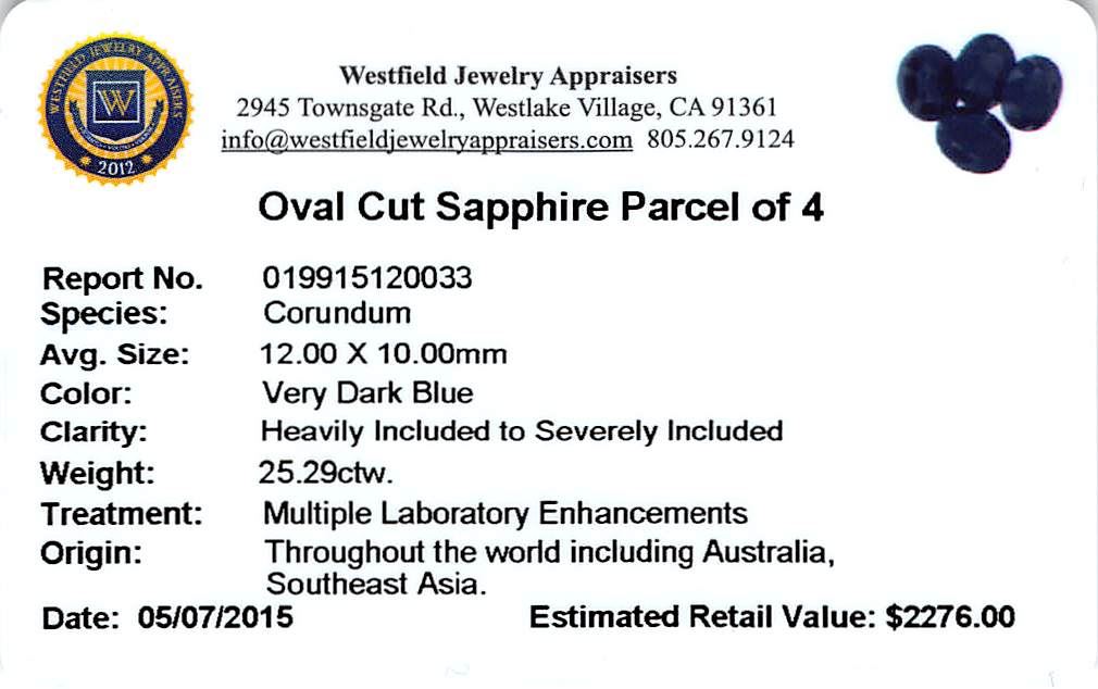 Four oval cut sapphires, measuring 12.00 x 10.00mm, approximate total weight of 25.29ct., clarity is heavily included to severely included, very dark blue color. Indications of multiple laboratory enhancements. Westfield Appraised at $2,276.00.
