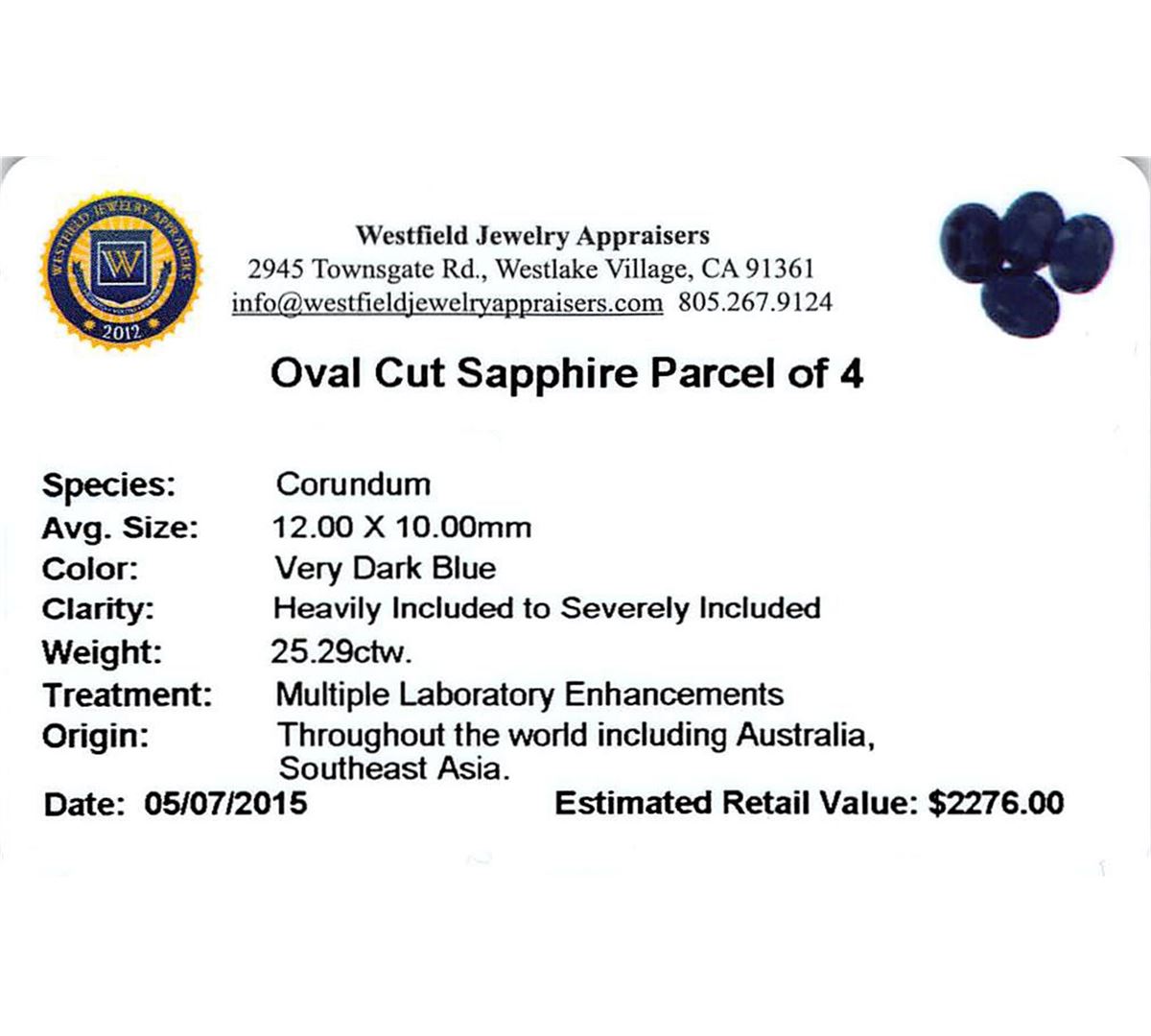 Four oval cut sapphires, measuring 12.00 x 10.00mm, approximate total weight of 25.29ct., clarity is heavily included to severely included, very dark blue color. Indications of multiple laboratory enhancements. Westfield Appraised at $2,276.00.
