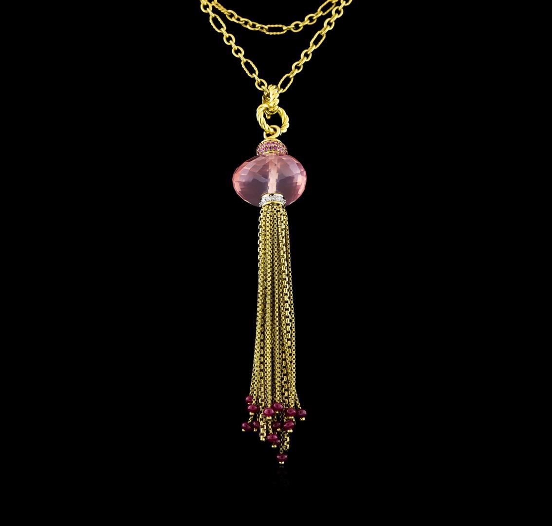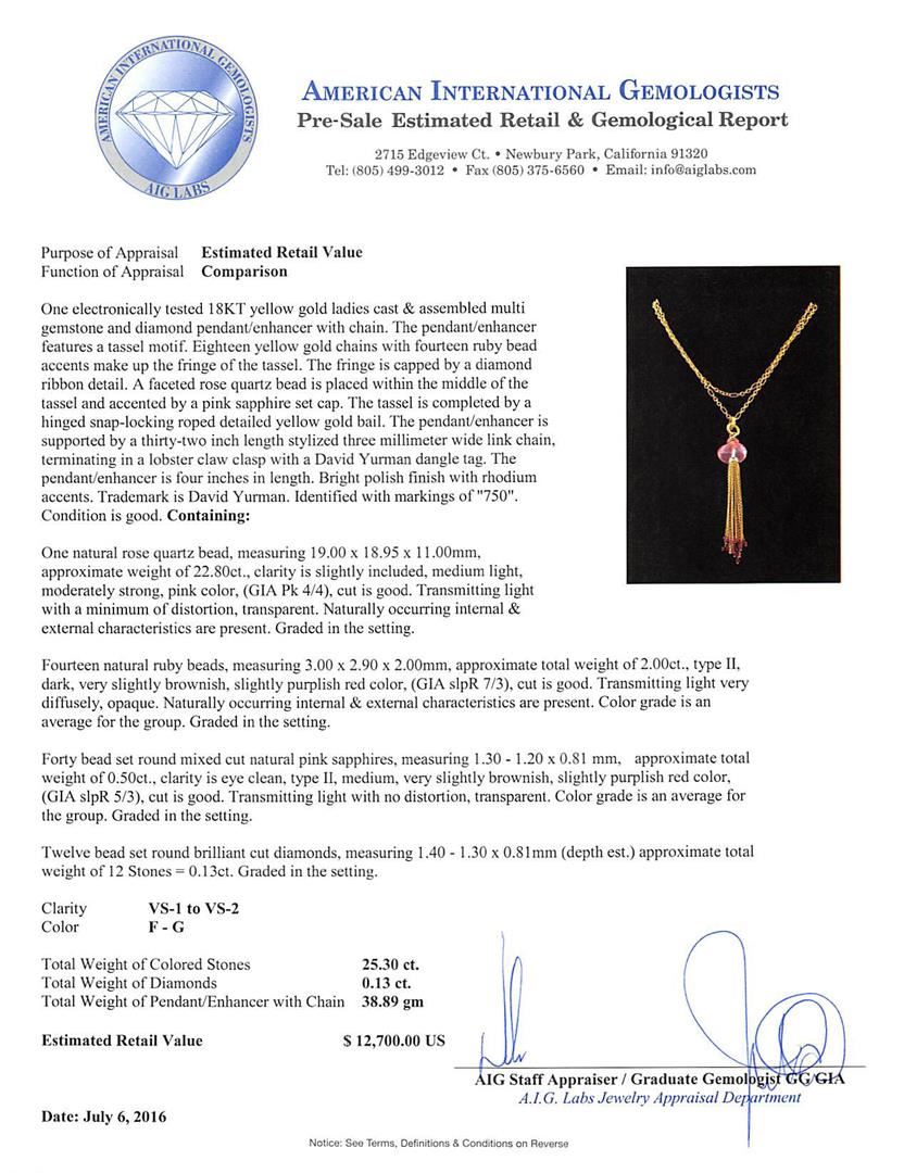 One electronically tested 18KT yellow gold ladies cast & assembled multi gemstone and diamond pendant/enhancer with chain. The pendant/enhancer features a tassel motif. Eighteen yellow gold chains with fourteen ruby bead accents make up the fringe of the tassel. The fringe is capped by a diamond ribbon detail. A faceted rose quartz bead is placed within the middle of the tassel and accented by a pink sapphire set cap. The tassel is completed by a hinged snap-locking roped detailed yellow gold bail. The pendant/enhancer is supported by a thirty-two inch length stylized three millimeter wide link chain, terminating in a lobster claw clasp with a David Yurman dangle tag. The pendant/enhancer is four inches in length. Bright polish finish with rhodium accents. Trademark is David Yurman. Identified with markings of "750". Condition is good. Containing: Fourteen bead cut natural rubies, measuring 3.00 x 2.90 x 2.00mm, approximate total weight of 2.00ct., type II, dark, very slightly brownish, slightly purplish red color, (GIA slpR 7/3), cut is good. Transmitting light very diffusely, opaque. Naturally occurring internal & external characteristics are present. Color grade is an average for the group. Graded in the setting. Forty bead set round mixed cut natural pink sapphires, measuring 1.30 - 1.20 x 0.81 mm, approximate total weight of 0.50ct., clarity is eye clean, type II, medium, very slightly brownish, slightly purplish red color, (GIA slpR 5/3), cut is good. Transmitting light with no distortion, transparent. Color grade is an average for the group. Graded in the setting. One briolette cut natural rose quartz, measuring 19.00 x 18.95 x 11.00mm, approximate weight of 22.80ct., clarity is slightly included, medium light, moderately strong, pink color, (GIA Pk 4/4), cut is good. Transmitting light with a minimum of distortion, transparent. Naturally occurring internal & external characteristics are present. Graded in the setting. Twelve bead set round brilliant cut diamonds, measuring 1.40 - 1.30 x 0.81mm (depth est.) approximate total weight of 12 Stones = 0.13ct. Graded in the setting. Clarity: VS-1 to VS-2. Color: F - G. Total Weight of Colored Stones 25.30ct. Total Weight of Diamonds 0.13ct. Total Weight of Pendant/Enhancer With Chain 38.89gm. AIG Appraised at $12,700.00.