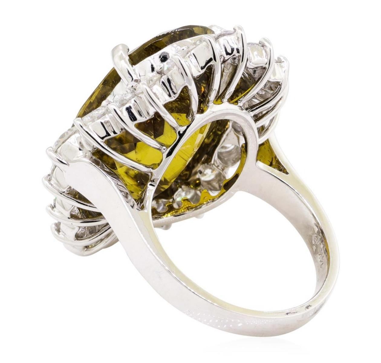 One electronically tested 14KT white gold lady's cast fashion ring with a basket halo with a bright polish finish. The featured lady's ring has a shank measuring 2.90 millimeters wide. Identified with markings of '14K'. Condition is new, good workmanship. Containing: One prong set oval modified mixed cut natural golden tourmaline, measuring 22.07 x 14.44 x 9.86mm, (depth est.) 12%. bulge factor, approximate weight of 22.85ct., clarity is eye clean, medium dark, brownish, yellowish orange color, (GIA yO 6/1), cut is very good. Transmitting light with no distortion, transparent. Colored gemstones are presumed to have been subjected to commonly used enhancement processes. Graded in the setting in the GIA Laboratory, Report #2183928822. Two prong set round brilliant cut diamonds, measuring 3.90 - 3.85 x 2.41mm (depth est.) approximate total weight of 2 Stones = 0.45ct. Graded in the setting. Color H - I Clarity SI-2 Cut Good Twenty prong set round brilliant cut diamonds, measuring 3.20 - 2.80 x 1.80mm (depth est.) approximate total weight of 20 Stones = 2.00ct. Graded in the setting. Color H - I Clarity SI-1 to SI-2 Cut Good. Total Weight of Colored Stones 22.85ct.. Total Weight of Diamonds 2.45ct.. Total Weight of Ring 13.80gm GAS Appraised at $21445.00. GAS Appraised.