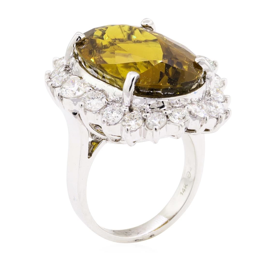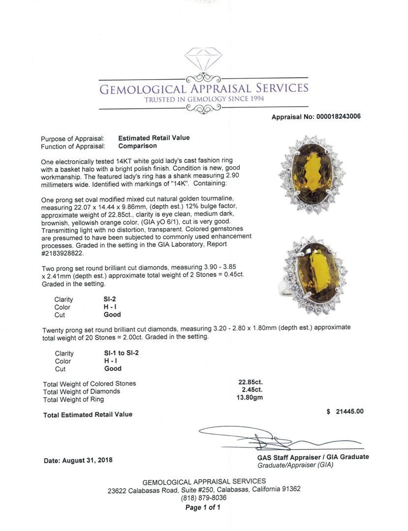 One electronically tested 14KT white gold lady's cast fashion ring with a basket halo with a bright polish finish. The featured lady's ring has a shank measuring 2.90 millimeters wide. Identified with markings of '14K'. Condition is new, good workmanship. Containing: One prong set oval modified mixed cut natural golden tourmaline, measuring 22.07 x 14.44 x 9.86mm, (depth est.) 12%. bulge factor, approximate weight of 22.85ct., clarity is eye clean, medium dark, brownish, yellowish orange color, (GIA yO 6/1), cut is very good. Transmitting light with no distortion, transparent. Colored gemstones are presumed to have been subjected to commonly used enhancement processes. Graded in the setting in the GIA Laboratory, Report #2183928822. Two prong set round brilliant cut diamonds, measuring 3.90 - 3.85 x 2.41mm (depth est.) approximate total weight of 2 Stones = 0.45ct. Graded in the setting. Color H - I Clarity SI-2 Cut Good Twenty prong set round brilliant cut diamonds, measuring 3.20 - 2.80 x 1.80mm (depth est.) approximate total weight of 20 Stones = 2.00ct. Graded in the setting. Color H - I Clarity SI-1 to SI-2 Cut Good. Total Weight of Colored Stones 22.85ct.. Total Weight of Diamonds 2.45ct.. Total Weight of Ring 13.80gm GAS Appraised at $21445.00. GAS Appraised.