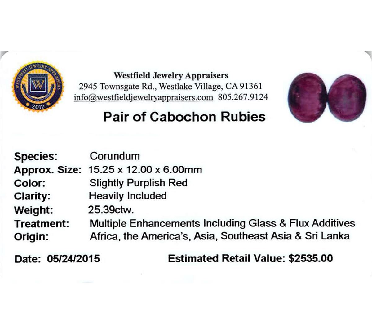 Two oval cabochon cut natural rubies, measuring 15.25 x 12.00 x 6.00mm, exact total weight 25.39ct., clarity is heavily included, type II, dark, very slightly brownish, slightly purplish red color, (GIA slpR 7/3), cut is good. Transmitting light diffusely, opaque. Naturally occurring internal & external characteristics are present. Indications of laboratory high temperature heat treatment, with glass & flux additives. Ruby has a low tolerance to rhodium plating, repolishing the surface, & ultrasonic cleaning. UGS Appraised at $2,535.00.