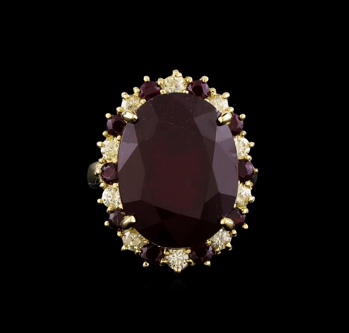 One electronically tested 14KT yellow gold ladies cast ruby and diamond ring with a bright polish finish. The featured ruby is set within a diamond and ruby bezel supported by a ribbed under gallery, completed by a two millimeter wide band. Identified with markings of "K14". Condition is new, good workmanship. Containing: One prong set oval mixed cut natural ruby approximate weight of 24.28ct., clarity is heavily included, type II, dark, very slightly brownish, red color, (GIA R 7/3), cut is good. Transmitting light somewhat diffusely, translucent. Naturally occurring internal & external characteristics are present. Indications of laboratory high temperature heat treatment, with glass & flux additives. Graded in the setting. Ruby has a low tolerance to rhodium plating, repolishing the surface, & ultrasonic cleaning. Ten prong set round mixed cut natural rubies approximate total weight of 1.12ct., clarity is heavily included, type II, dark, very slightly brownish, red color, (GIA R 7/3), cut is good. Transmitting light with some distortion, transparent to translucent. Naturally occurring internal & external characteristics are present. Color grade is an average for the group. Graded in the setting. Ten prong set round brilliant cut diamonds approximate total weight of 10 Stones = 0.78ct. The group is composed of a mix of natural faint yellow and very light yellow diamonds. Graded in the setting. Clarity: I-1 to I-2. Total Weight of Colored Stones 25.40ct. Total Weight of Diamonds 0.78ct. Total Weight of Ring 11.08gm. AIG Appraised at $7,315.00.