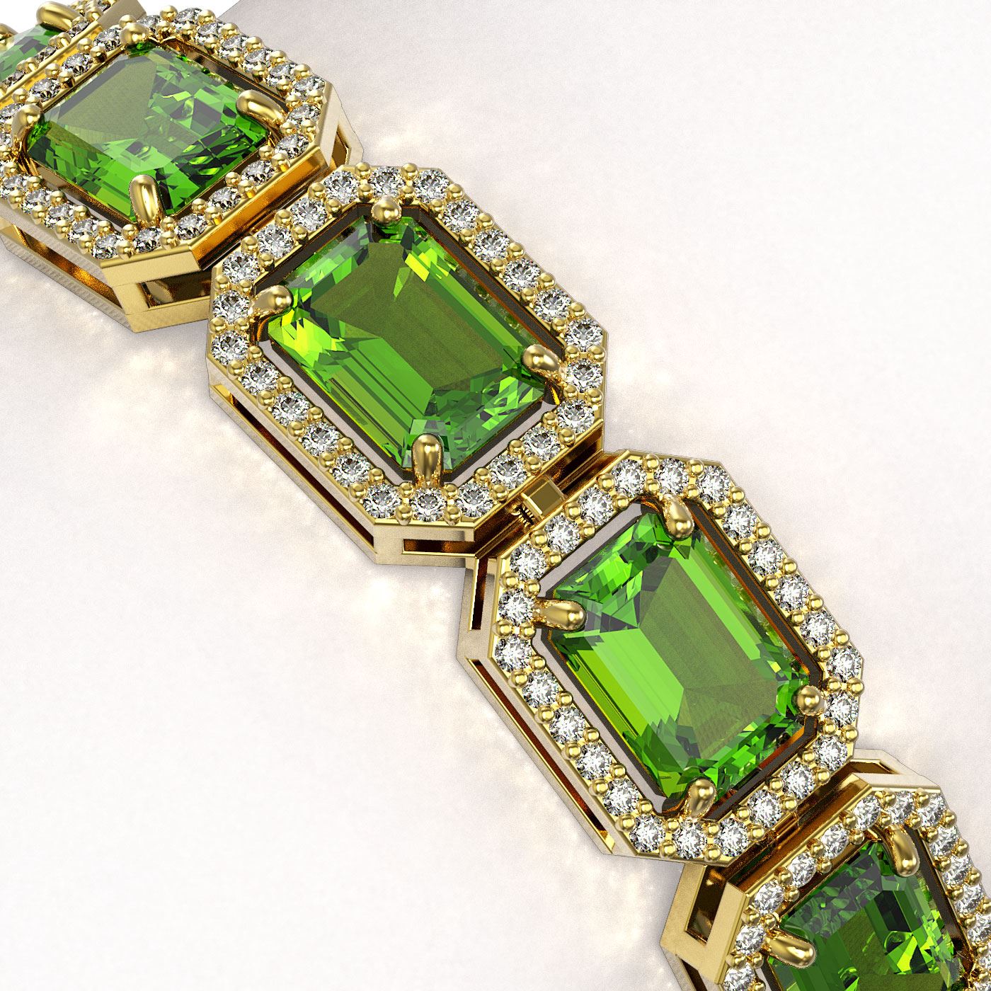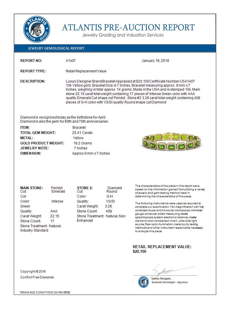 REF-365N8Y -41407 ---- 25.41 CTW Peridot & Diamond Halo Bracelet 10K Yellow Gold ---- Luxury Designer Brand Bracelet Appraised at $20,100 Certificate Number US41407 10k Yellow gold, Bracelet Size is 7 Inches, Bracelet measuring approx. 9 mm x 7 Inches, weighing in total approx. 14 grams. Made in the USA and is stamped 10k, Main stone 22.15 carat total weight containing 17 pieces of Intense Green color with AAA quality Emerald Cut shape cut Peridot , Stone #2 3.26 carat total weight containing 408 pieces of G-H color with VS/SI quality Round shape cut Diamond