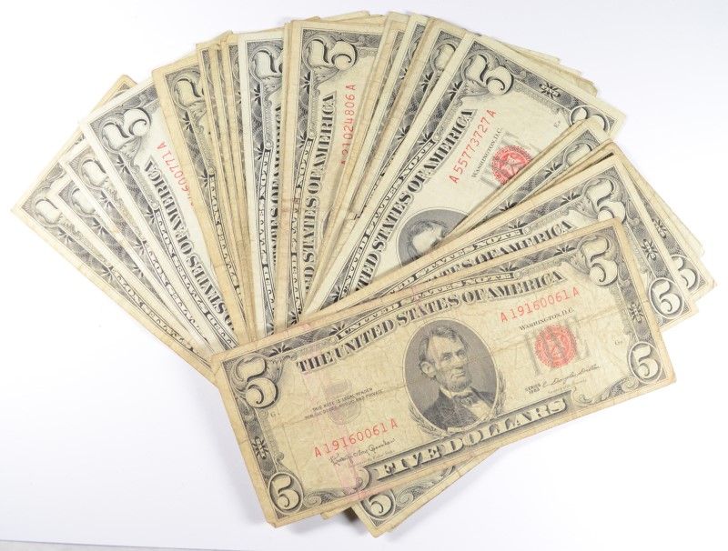 ( 25 ) $5.00 U.S. RED SEAL NOTES, AVE. CIRCULATED
