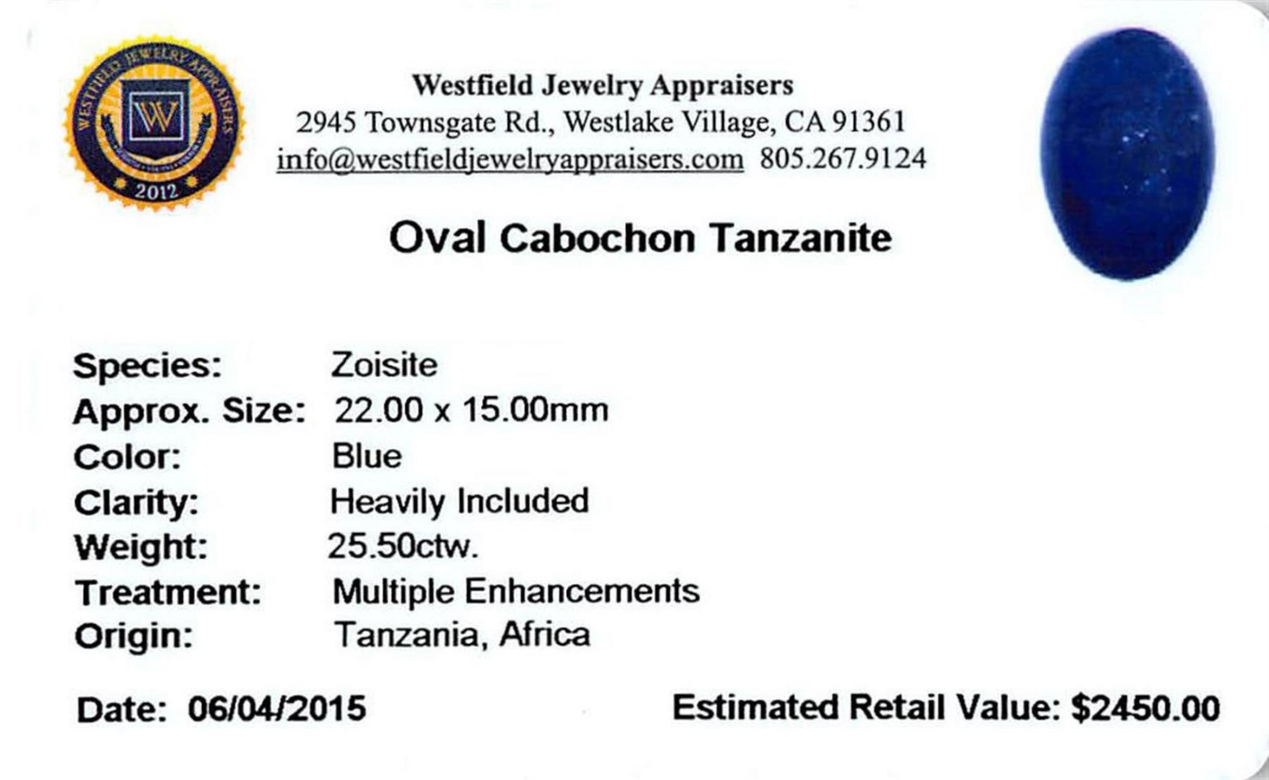 One oval cabochon cut natural tanzanite, measuring 22.00 x 15.00 x 8.50mm, exact weight 25.50ct., clarity is heavily included, type I, dark, very slightly grayish, blue color, (GIA B 7/3), cut is good. Transmitting light somewhat diffusely, transparent to translucent. Naturally occurring internal & external characteristics are present. Indications of heat treatment. Westfield Appraised.
