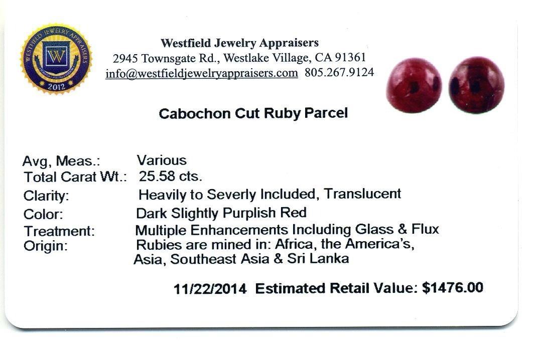 25.58ctw. Cabochon Cut Ruby Parcel. Westfield Appraised.