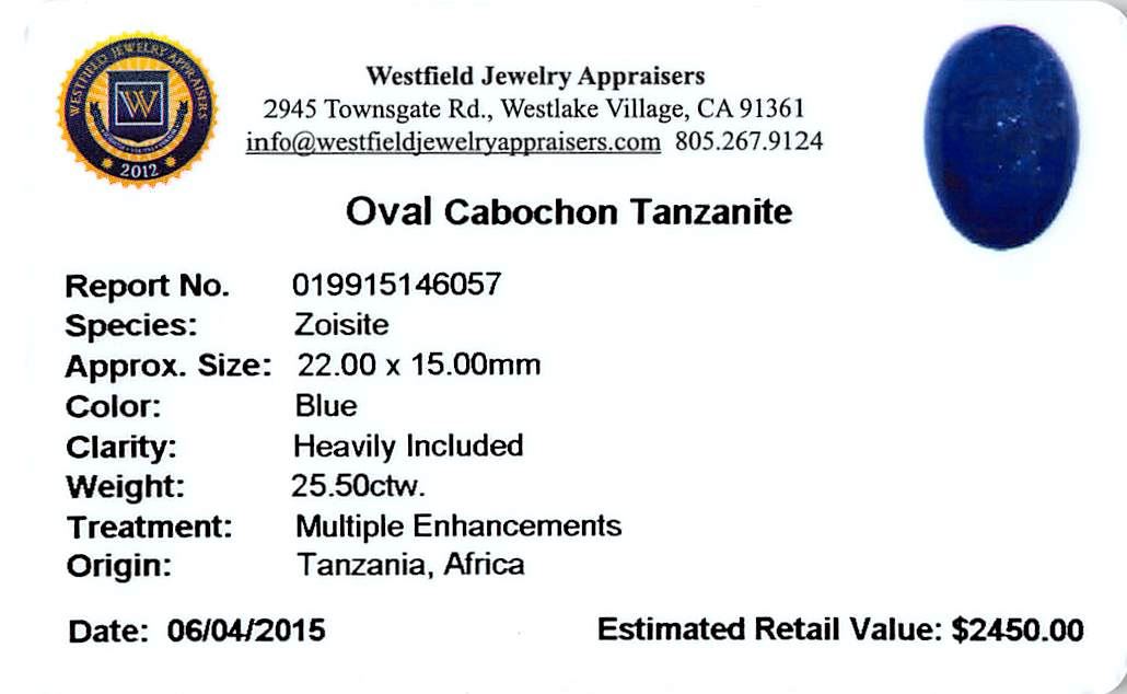 One oval cabochon cut natural tanzanite, measuring 22.00 x 15.00 x 8.50mm, exact weight 25.50ct., clarity is heavily included, type I, dark, very slightly grayish, blue color, (GIA B 7/3), cut is good. Transmitting light somewhat diffusely, transparent to translucent. Naturally occurring internal & external characteristics are present. Indications of heat treatment. Westfield Appraised at $2,450.00.