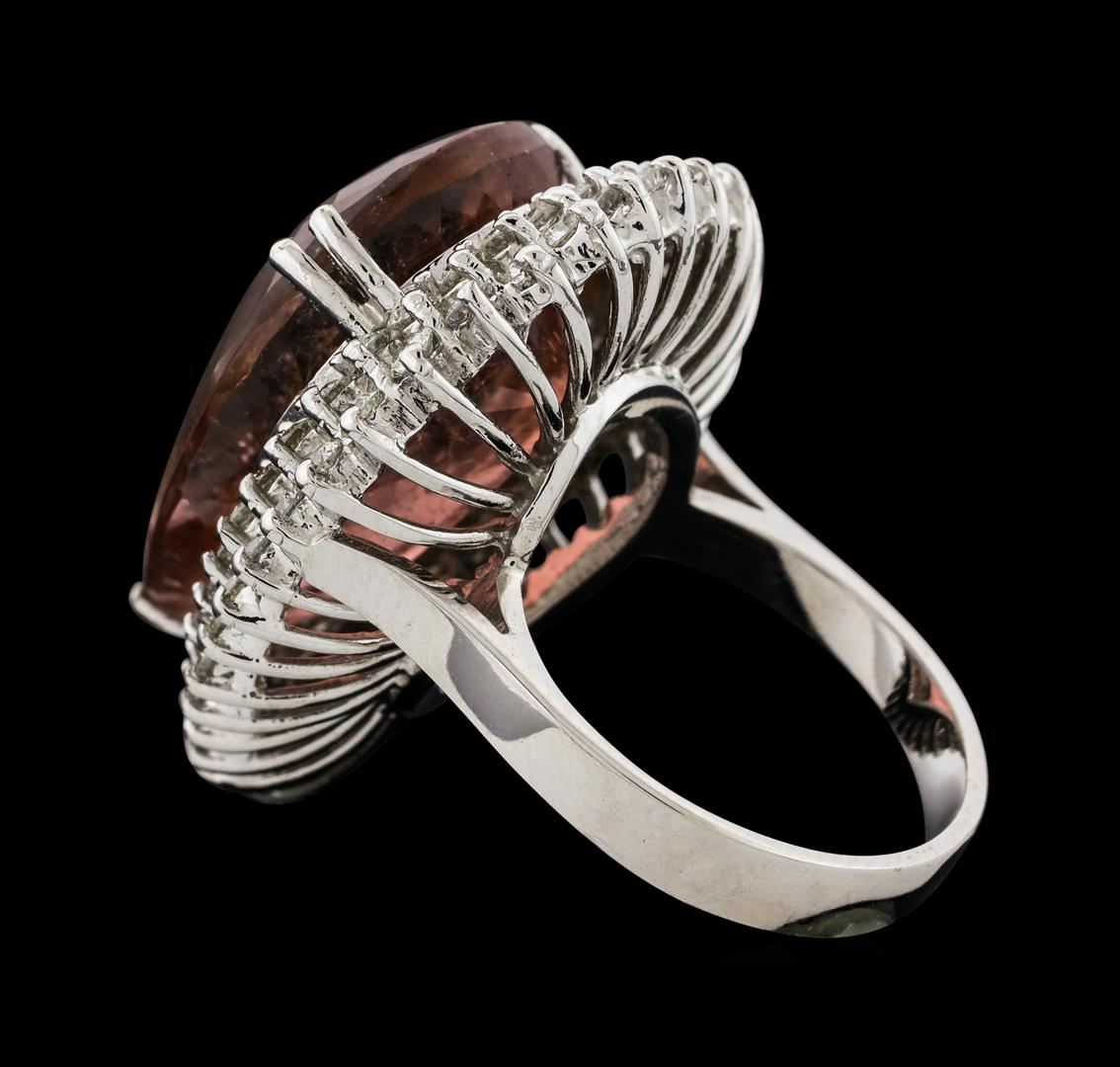 One 14KT White Gold "One of a Kind" Lady's Ring, 15.22 grams. Containing: Main Gemstones: Identity: Natural Tourmaline. Carat Weight: 25.76 cts tw. Shape & Measurement: Pear Shape. Quality: Fine Peach Color Tourmaline. Adjacent Gemstones: Identity: Natural Diamond. Shape: Round Brilliant Cut. Carat Weight: 2.15 cts tw. Quality: VS-SI Clarity, G-H Color. All fine cutting and proportions. Total Gemstones Weight: 27.91 cts tw. RBGS Appraised at $20,000.00.