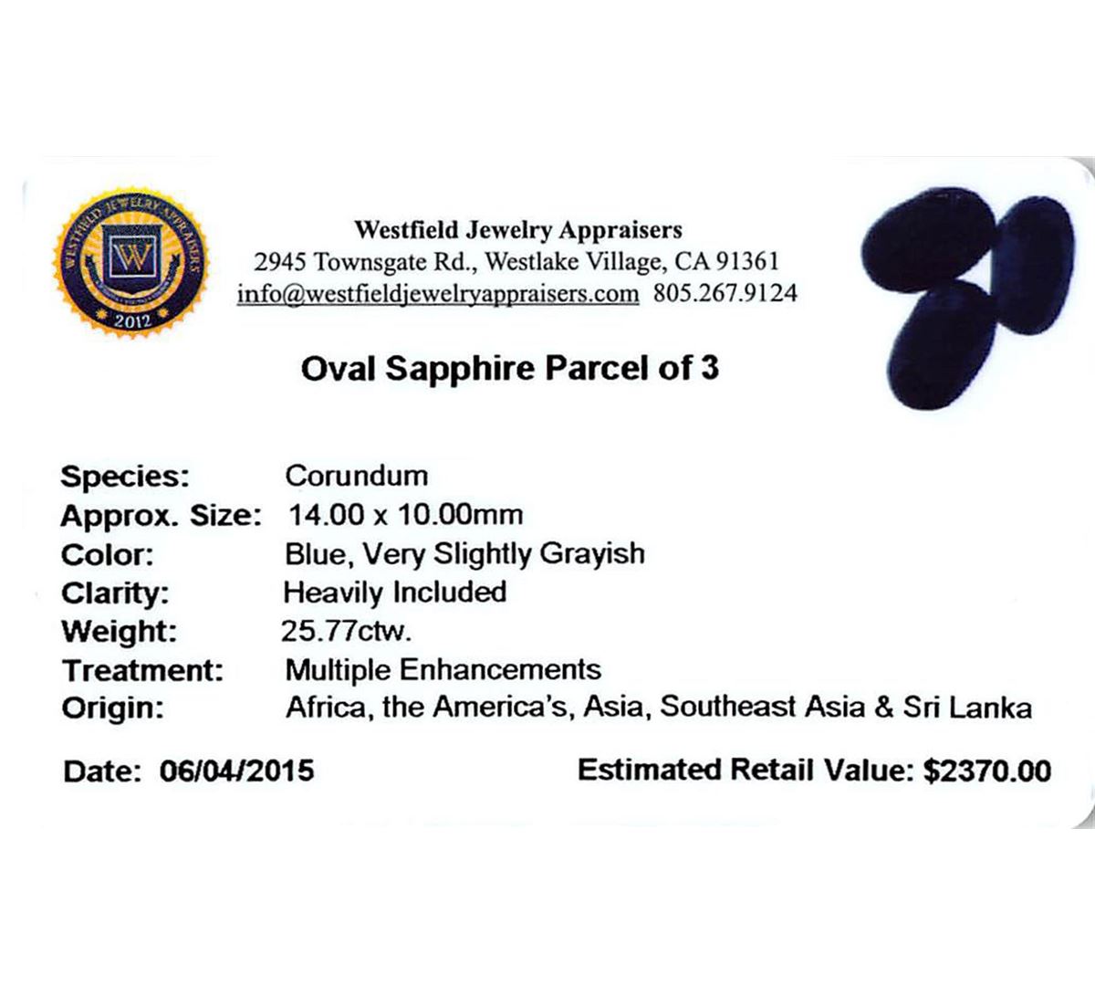 Three oval mixed cut natural blue sapphires, measuring 14.00 x 10.00 x 0.00mm, exact total weight 25.77ct., clarity is heavily included, type II, very dark, very slightly grayish, blue color, (GIA B 8/3), cut is good. Measurements are an average for the group. Transmitting light very diffusely, opaque, Naturally occurring internal & external characteristics are present, Indications of multiple laboratory enhancements, including high temperature heat treatment. Westfield Appraised at $2,370.00.