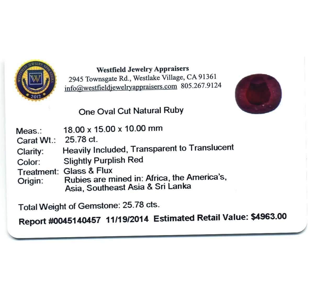 25.78ct. One Oval Cut Natural Ruby Westfield Appraised at $4,963.00.