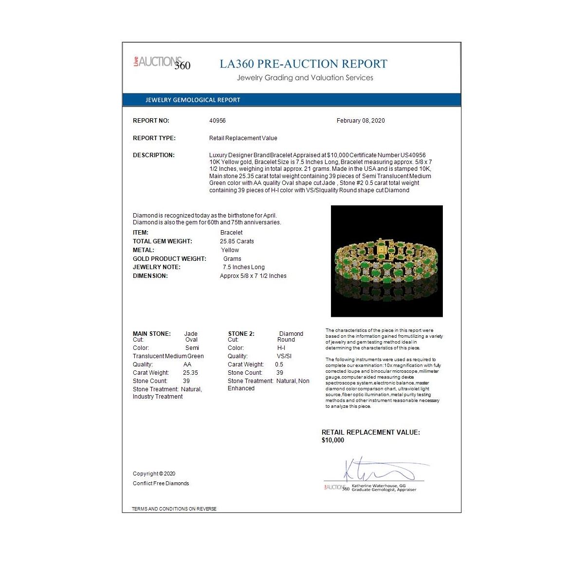 REF-227A3N - SKU: 40956 ---- 25.85 ctw Jade & Diamond Bracelet 10K Yellow Gold