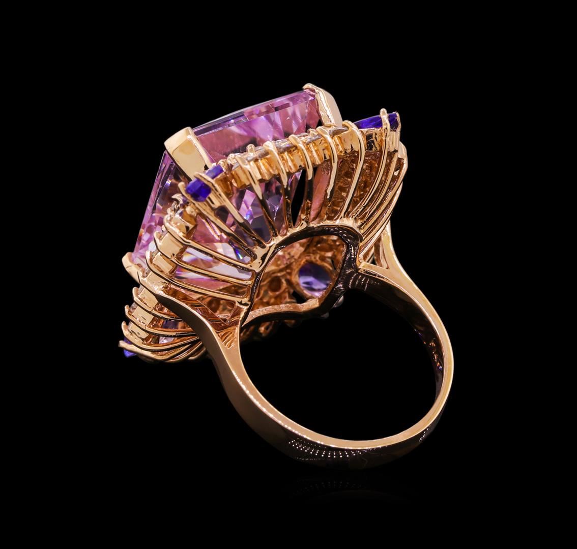 One electronically tested 14KT rose gold lady's cast fashion ring with a double basket halo with a bright polish finish. The featured lady's ring has a shank measuring 3.17 millimeters in width. Identified with markings of "K14". Condition is new, good workmanship. Containing: One prong set emerald modified brilliant cut natural kunzite, measuring 19.92 x 15.60 x 9.55mm, (depth est.) approximate weight of 25.85ct., clarity is eye clean, light, moderately strong, reddish purple color, (GIA rP 3/4), cut is very good. Transmitting light with no distortion, transparent. Colored gemstones are presumed to have been subjected to commonly used enhancement processes. Graded in the setting. Four prong set pear brilliant cut natural tanzanites, measuring 6.00 x 4.00 x 2.60mm, (depth est.) approximate total weight of 1.57ct., clarity is eye clean, medium, moderately strong, violetish blue color, (GIA vB 5/4), cut is very good. Transmitting light with no distortion, transparent. Colored gemstones are presumed to have been subjected to commonly used enhancement processes. Graded in the setting. Twenty-Four prong set round brilliant cut diamonds, measuring 2.30 - 2.25 x 1.39mm (depth est.) approximate total weight of 24 Stones = 1.00ct. Graded in the setting. Clarity: SI-1 to SI-2. Color: H - I. Cut Good Twenty-Four prong set round brilliant cut diamonds, measuring 1.90 - 1.80 x 1.15mm (depth est.) approximate total weight of 24 Stones = 0.56ct. Graded in the setting. Clarity: SI-1 to SI-2. Color: H - I. Cut Good. Total Weight of Colored Stones 27.42ct. Total Weight of Diamonds 1.56ct. Total Weight of Ring 17.00gm. GAS Appraised at $14,360.00.