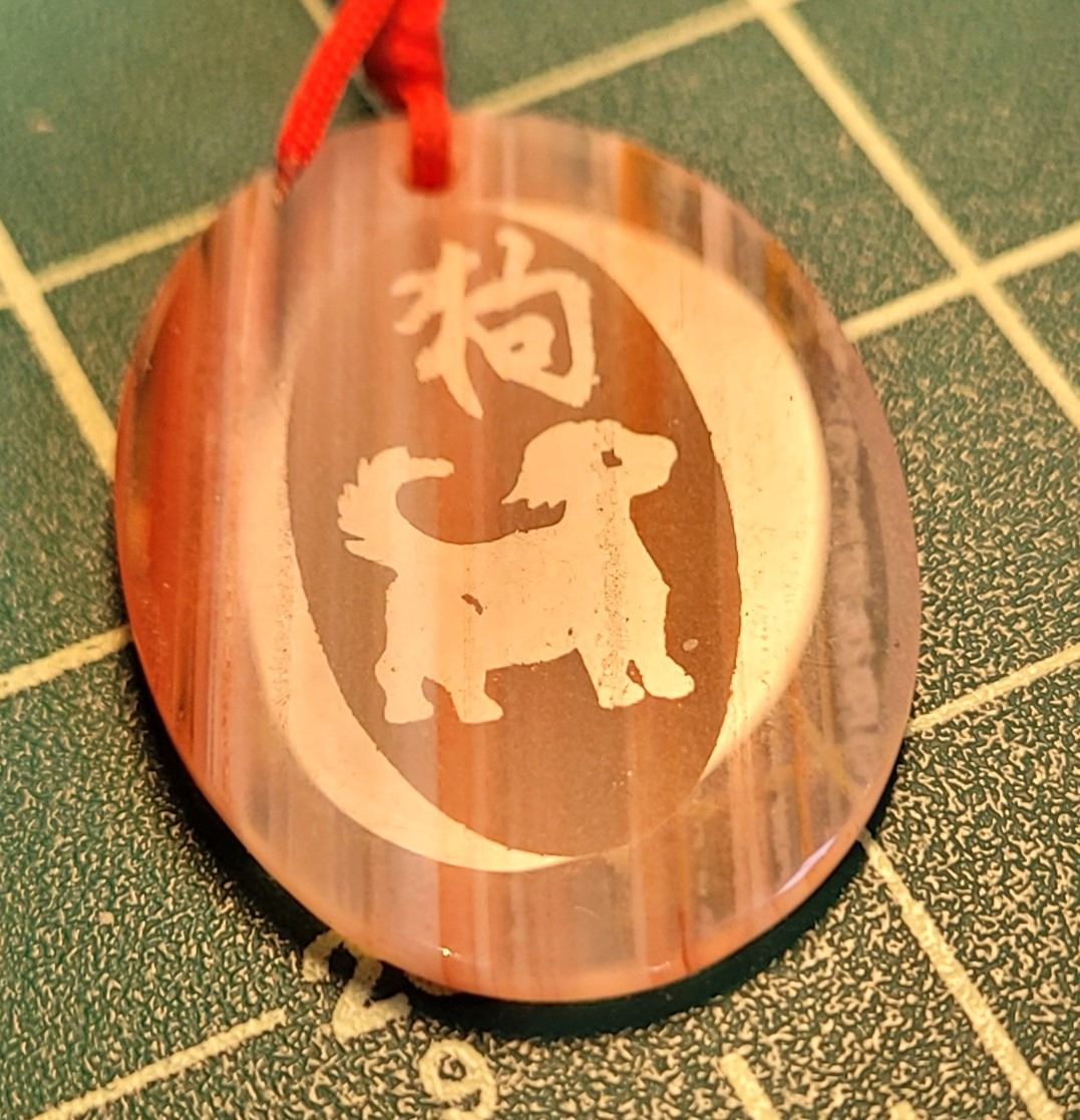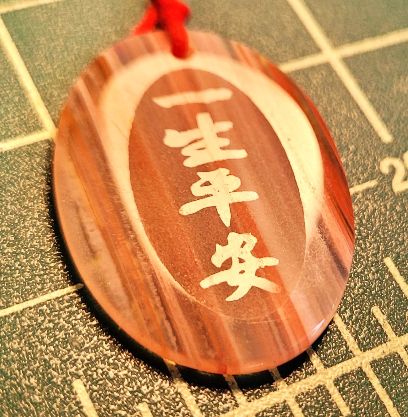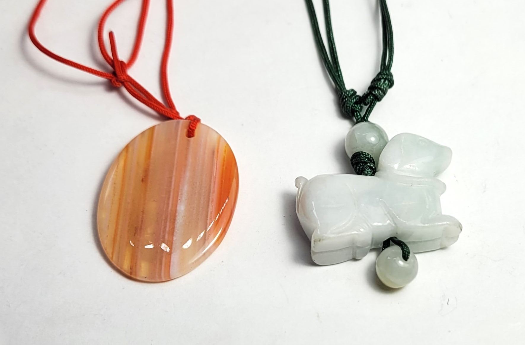 ON ONE SIDE AND ASIAN CHARACTERS ON THE OTHER, ONLY VISIBLE UNDER LIGHT AND PALE GREEN JADEITE LAMB, BOTH ON ADJUSTABLE SILK CORDS