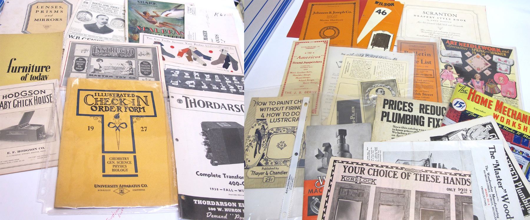 A wide variety of catalogs and brochures including Stromberg Carburetor, Sealbrand Shark leather 1930, Boots and Shoes from WB Geiser & Co. Buasch & Lomb Lenses, Prism and Mirrors 1937?, University Apparatus Co. 1927, Art Needlework 1934, Marine Hardware, Scranton Lace, several shaving items, Williams Machinist Tools and more. Date: Location: HWAC # 54406