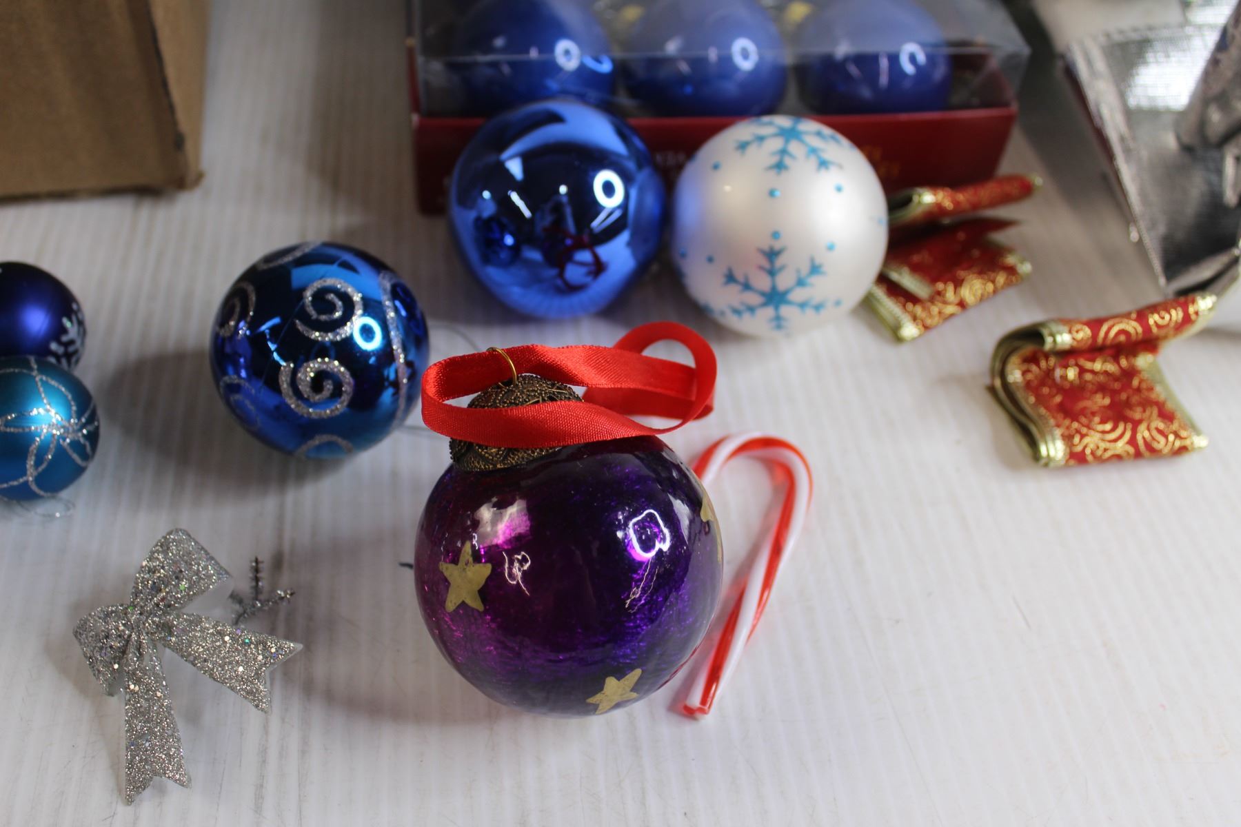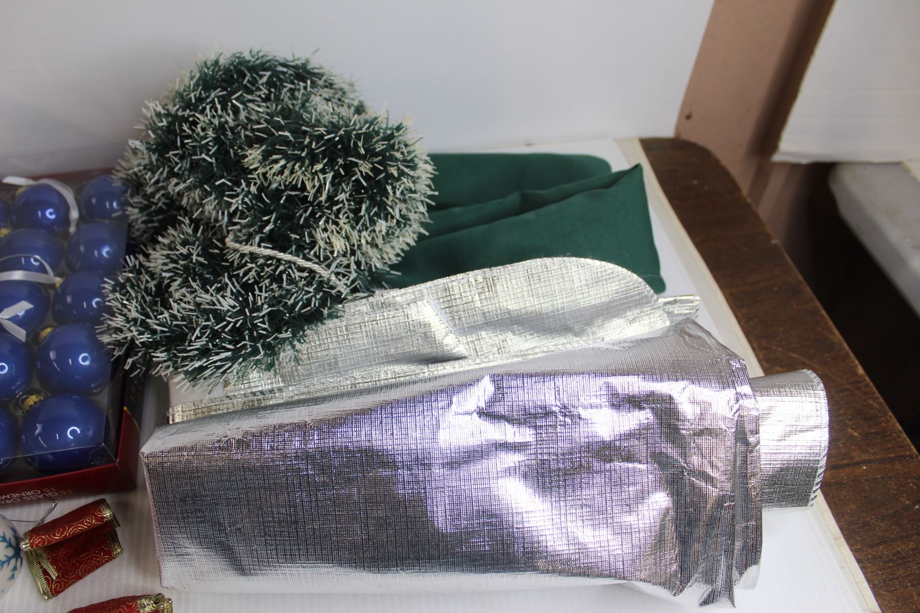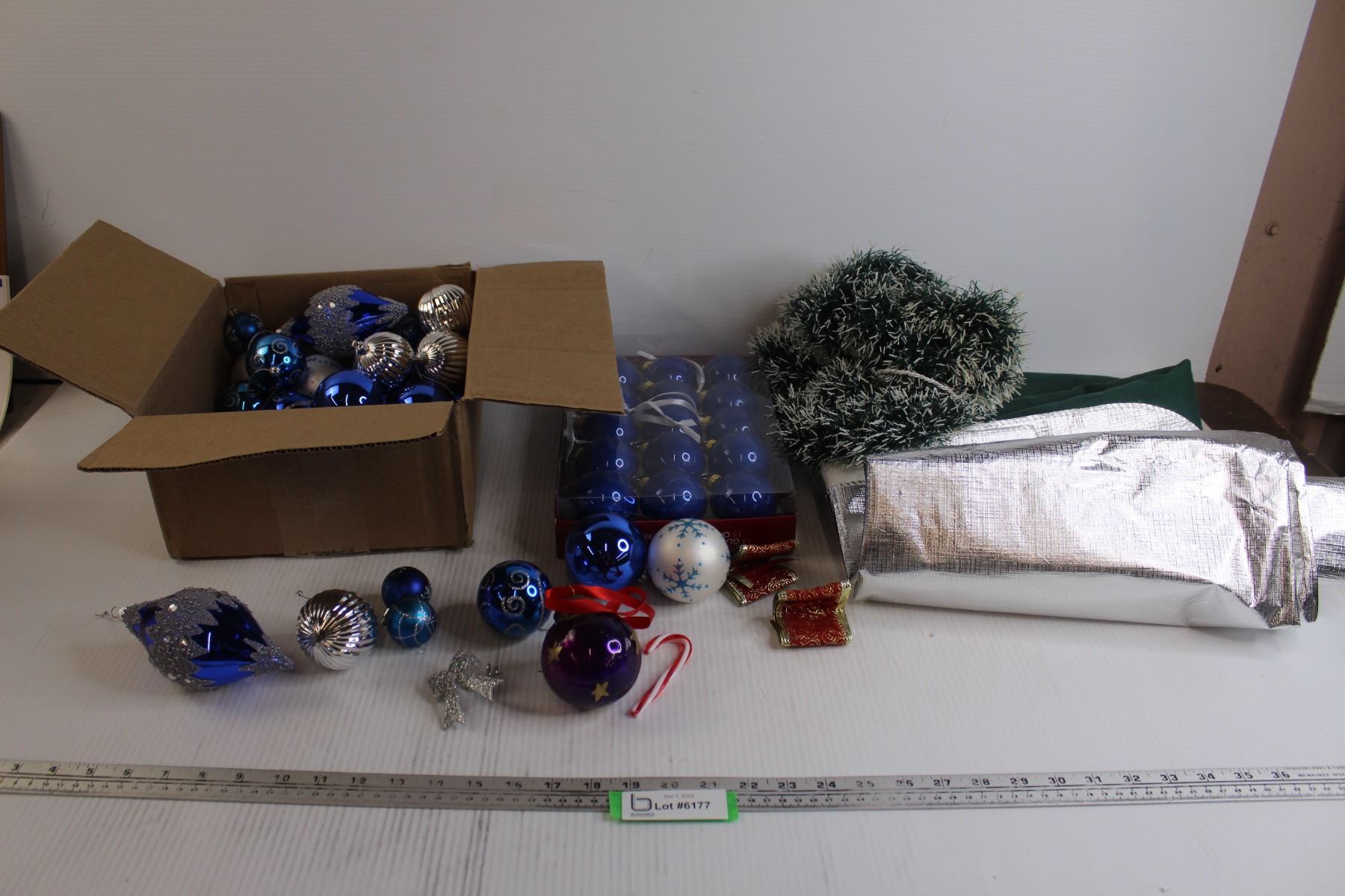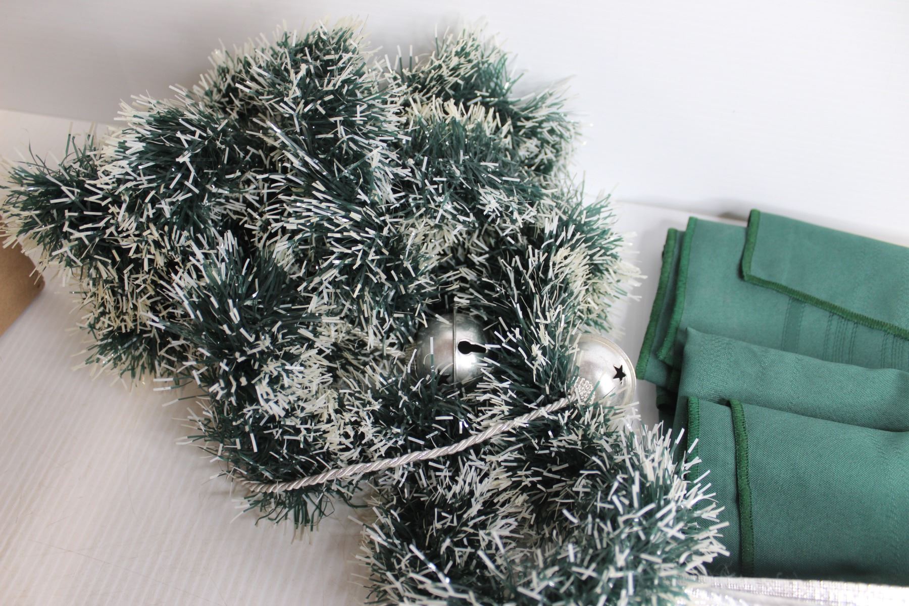 (25+) Assorted Christmas Ornaments, (2) Tablecloths, Garland