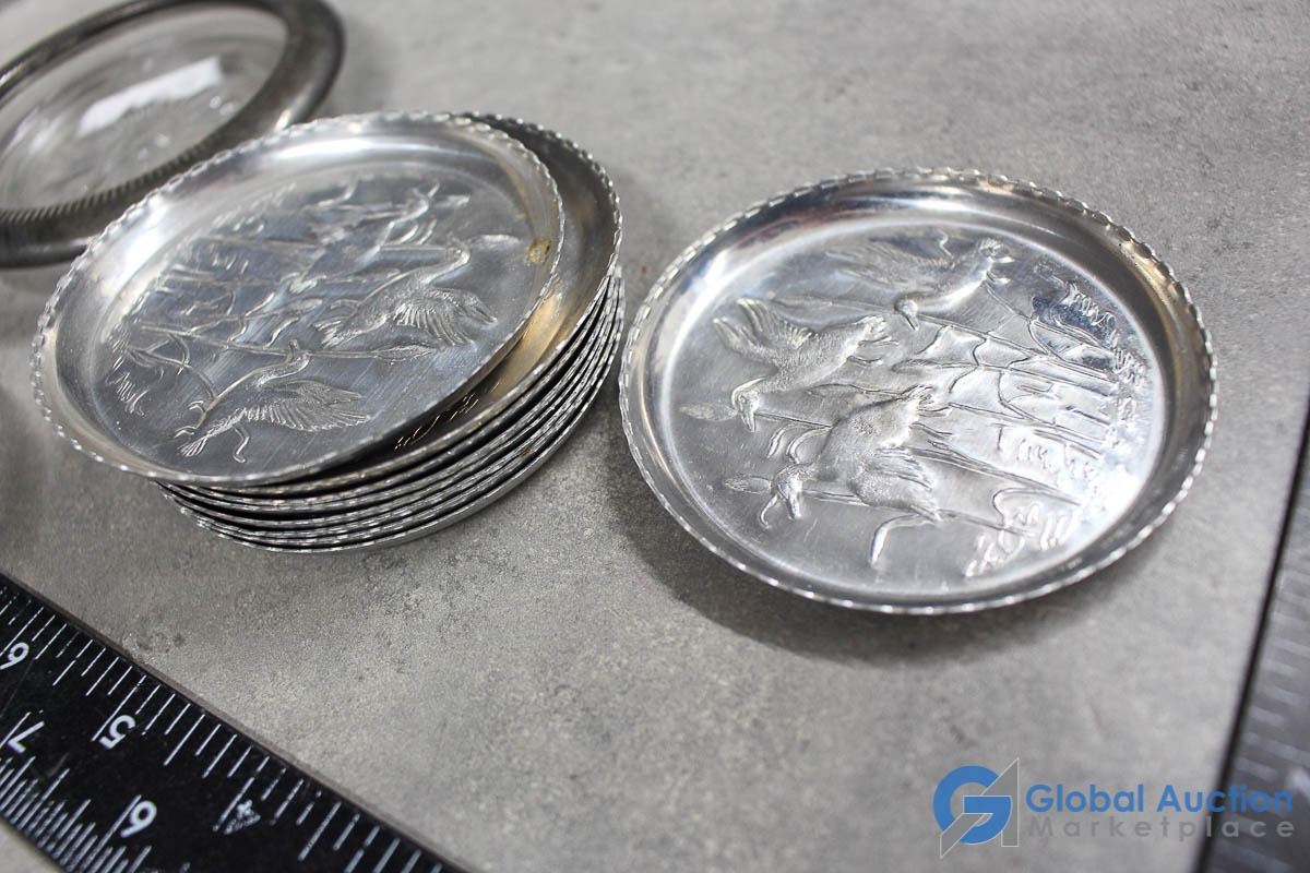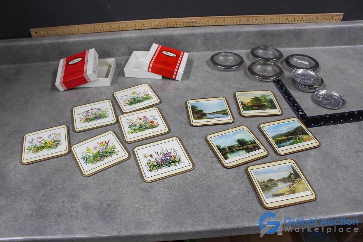 (4) Silver Plated Glass Coasters; (9) Tin Coaster; (2) Boxes of 6 Traditional Coasters by Pimpernel - Made in the UK