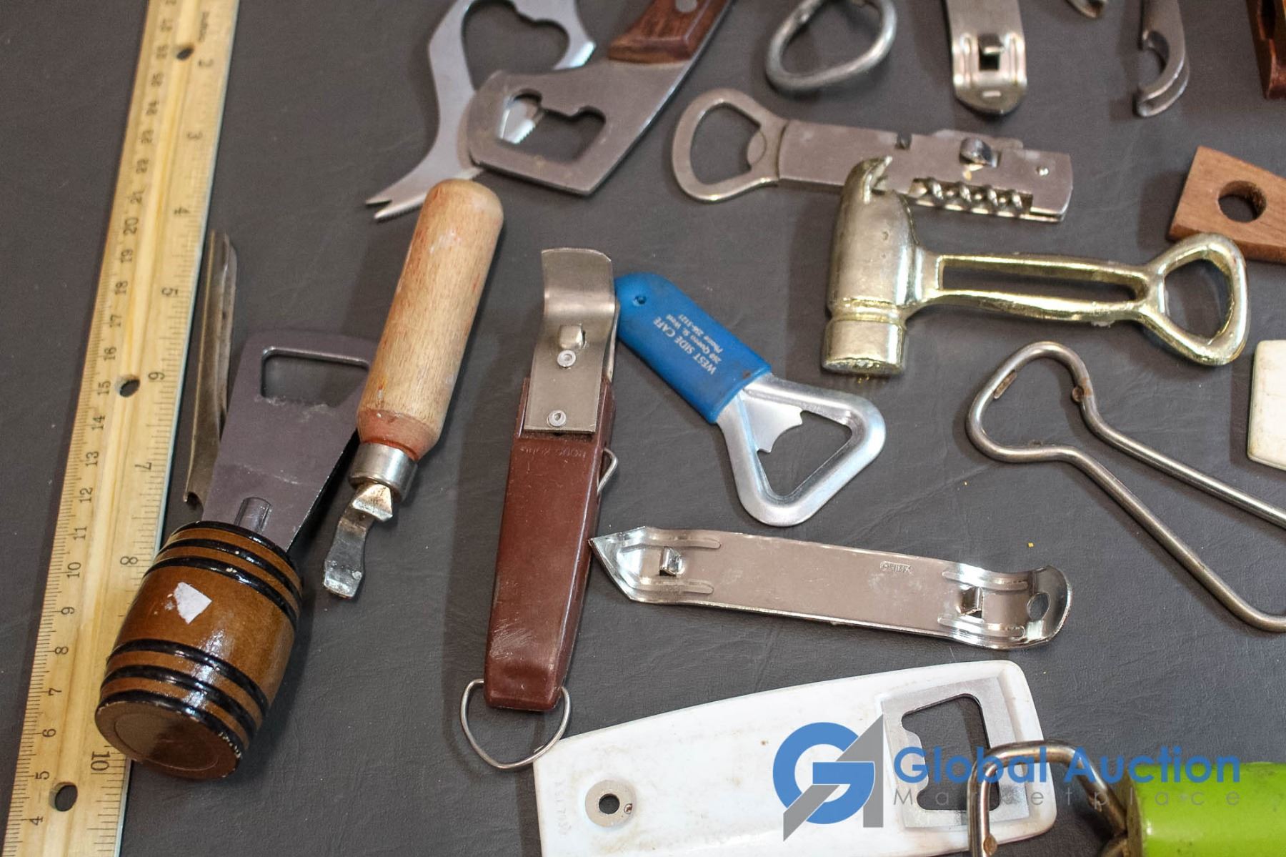 (25+) Bottle Openers and (2) Vintage Flashlights