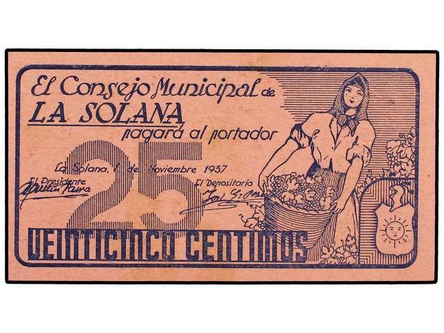 25 Céntimos. 1 Noviembre 1937. C.M. de LA SOLANA (Ciudad Real). Cartón. (Manchitas del tiempo). MUY ESCASO (en esta conservación). Mont-1375/A. S/C-.