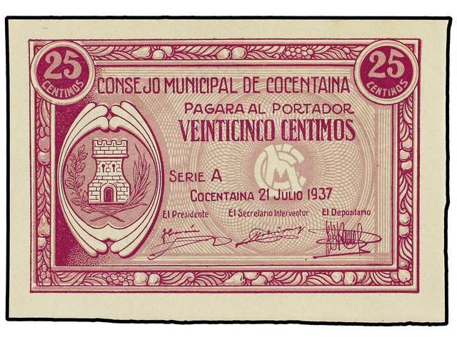 25 Céntimos. 21 Julio 1937. C.M. de COCENTAINA (ALICANTE). ESCASO. TV-599c. SC.
