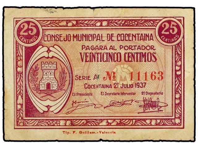 25 Céntimos. 21 Julio 1937. C.M. de COCENTAINA (Valencia). (Pequeñas roturas , algunas reparadas con cinta adhesiva). ESCASO. Mont-533/A. MBC.