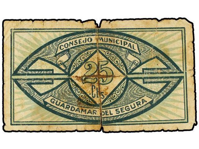 25 Céntimos. 5 Junio 1937. C.M. de GUARDAMAR DEL SEGURA (Alicante). (Roturas. Reparaciones. Manchas). ESCASO. Mont-744A; TV-827. BC-.