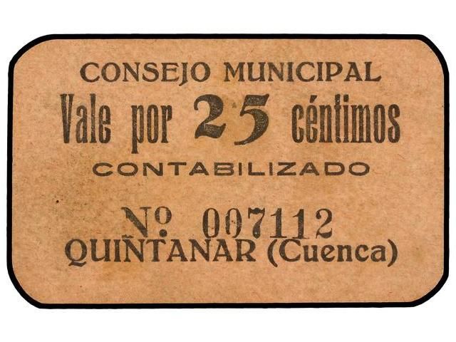25 Céntimos. C.M. de QUINTANAR (Cuenca). Cartón. (Sucio). Mont-1213A. SC.