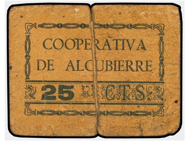 25 Céntimos. COOPERATIVA de ALCUBIERRE (Huesca). Cartulina. (Roturas). RARO. KG-57a. BC+.