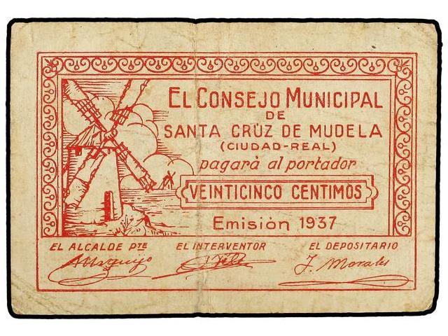 25 Céntimos. Emisión 1937. C.M. de SANTA CRUZ DE MUDELA (Ciudad Real). ESCASO. Mont-1321/A. MBC.