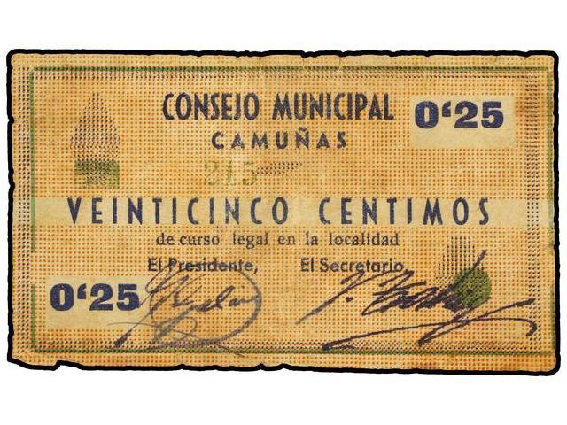 25 Céntimos. S/F. C.M. de CAMUÑAS (Toledo). (Pequeñas roturas en márgenes. Algo sucio). INÉDITO. KG-No cat. este valor; Mont-429 no cat. este valor. MBC-.