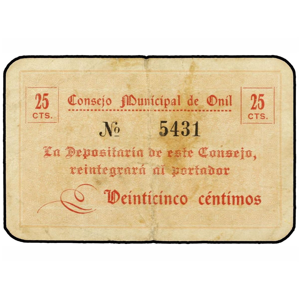 25 Céntimos. - S/F. - C.M. de ONIL (Alicante). - ESCASO. (Manchas). T-1035A. MBC. - -