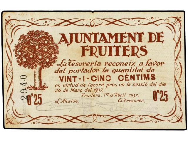 25 Cèntims. 1 Abril 1937. Aj. de FRUITERS. (Algo sucio). ESCASO. AT-1064; T-1235. MBC+.