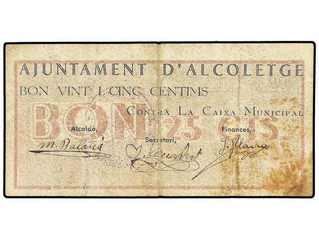 25 Cèntims. 1 Juliol 1937. Aj. d´ALCOLETGE. (Sucio). AT-82; T-105. MBC-.