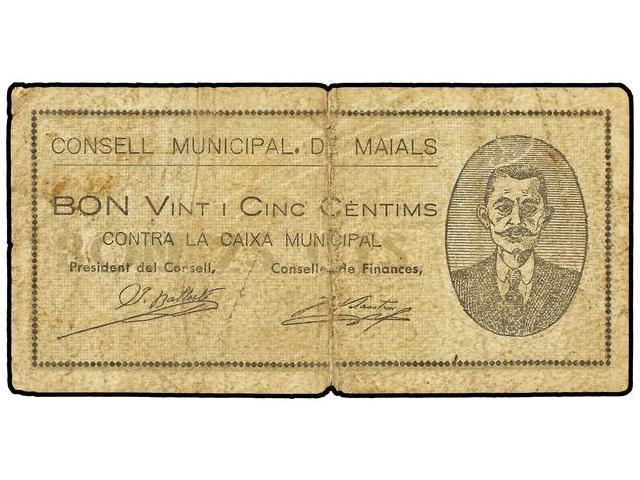 25 Cèntims. 1 Juliol 1937. C.M. de MAIALS. (Sucio. Roturas). RARO. AT-1399; T-1597. MBC-.
