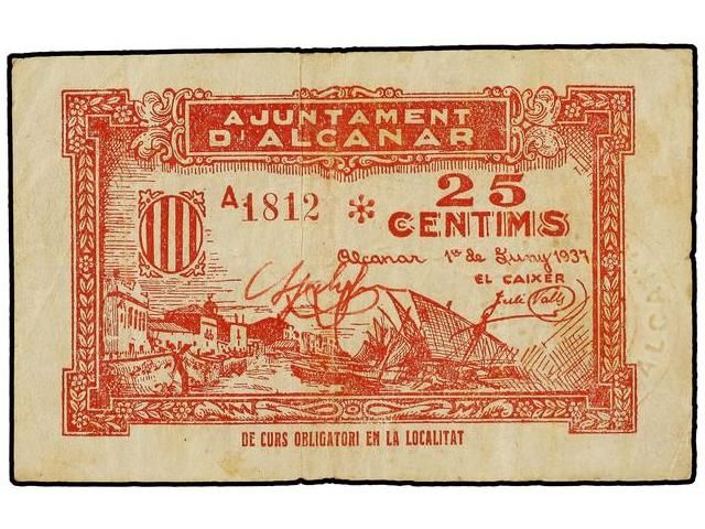 25 Cèntims. 1 Juny 1937. Aj. d´ALCANAR. ESCASO. AT-75. MBC.