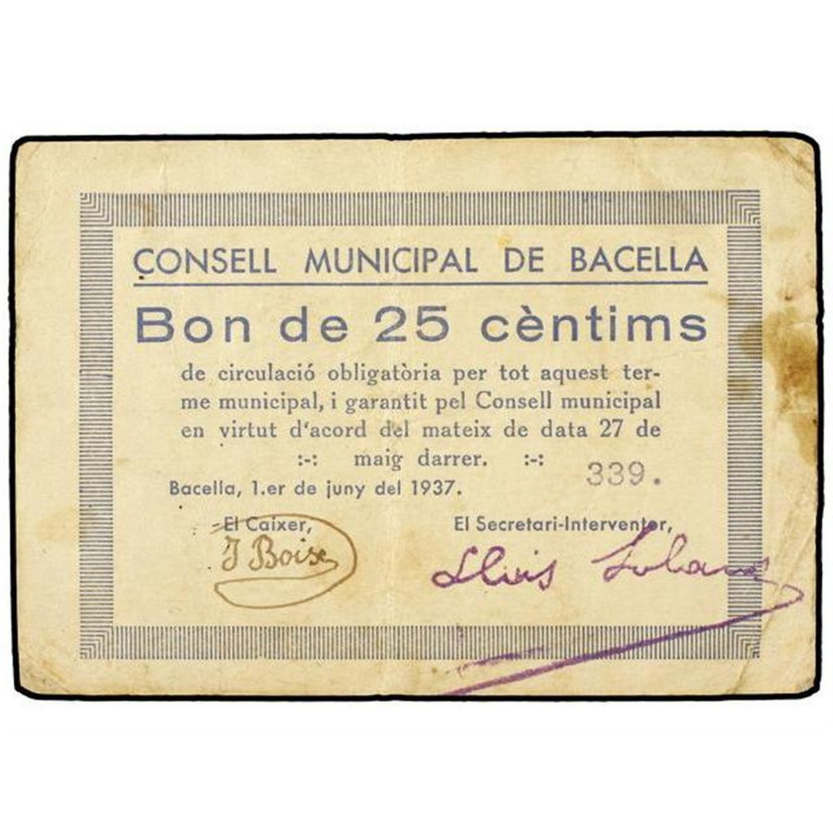 25 Cèntims. - 1 Juny 1937. - C.M. de BACELLA (BASSELLA). - (Pequeña mancha). RARO. AT-314; T-317. MBC. - -