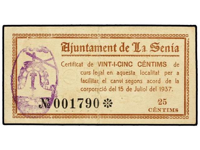 25 Cèntims. 15 Juliol 1937. Aj. de LA SÈNIA. AT-2332; T-2700. MBC+.