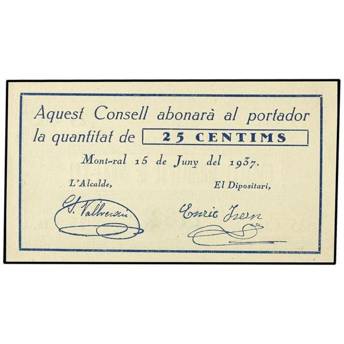 25 Cèntims. - 15 Juny 1937. - C.M. de MONT-RAL. - Sin sello tampón. ESCASA. AT-1595b; T-1831b. SC. - -