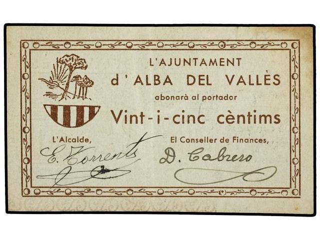 25 Cèntims. 1937. Aj. d´ALBA DEL VALLÈS. Conseller de Finances: Cabrero. (Pequeña mancha en una esquina). RARO. AT-52a; T-65a. EBC.