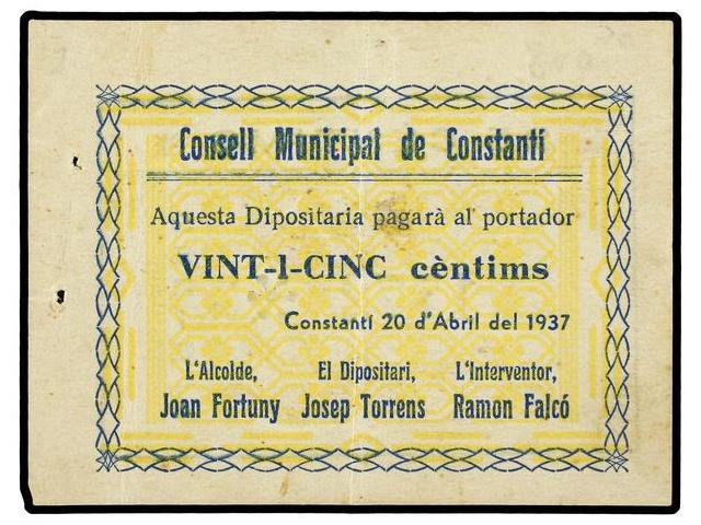25 Cèntims. 20 Abril 1937. C.M. de CONSTANTÍ. ESCASO. AT-868; T-1006. EBC.