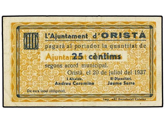 25 Cèntims. 20 Juliol 1937. Aj. d´ORISTÀ. Sin tampón. AT-1721a; T-1976. MBC+.