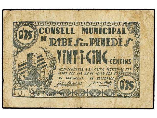 25 Cèntims. - 22 Maig 1937. - C.M. de RIBES DEL PENEDÈS. - (Sucio). AT-2115; T-2444. MBC-. - -