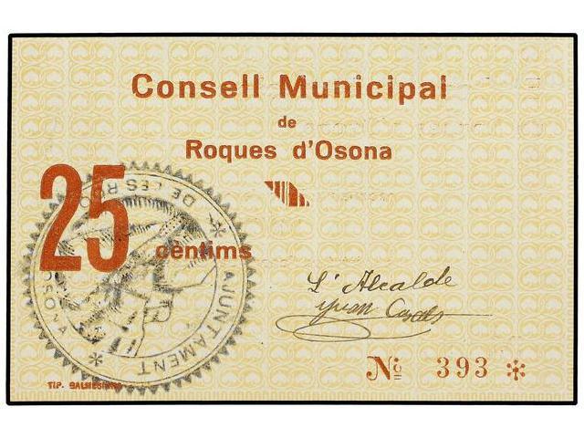 25 Cèntims. 23 Juliol 1937. C.M. de ROQUES D´OSONA. Firma del alcalde al reverso. Tirada: 1.000 billetes. RARO. AT-2198a; T-2539a. SC.