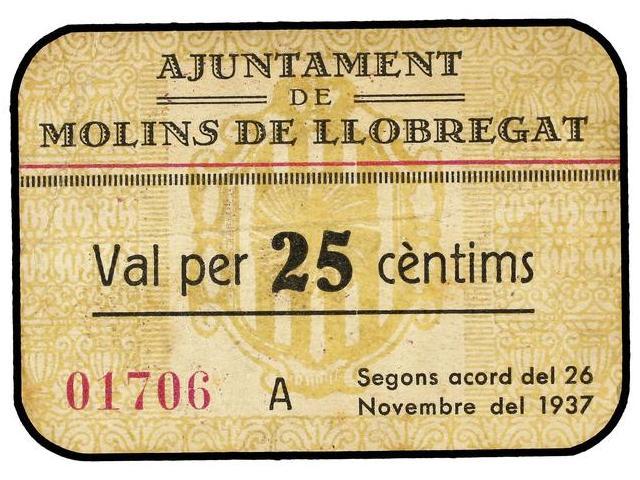25 Cèntims. 26 Novembre 1937. Aj. de MOLINS DE LLOBREGAT. Cartón. AT-1509b; T-1731b. MBC+.