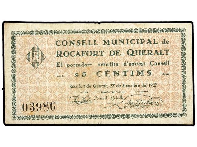 25 Cèntims. 27 Setembre 1937. C.M. de ROCAFORT DE QUERALT. (Algo sucio). AT-2177, T-2516. MBC+.