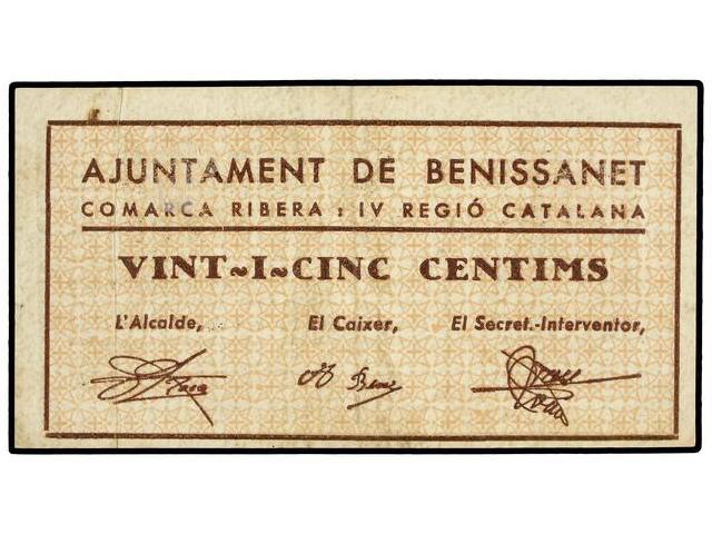 25 Cèntims. 31 Juliol 1937. C.M. de BENISSANET. (Algo sucio). ESCASO. AT-421; T-497. MBC+.