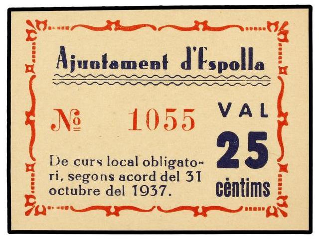 25 Cèntims. 31 Octubre 1937. Aj. d´ESPOLLA. Cartón. RARO. AT-966; T-1107. SC.