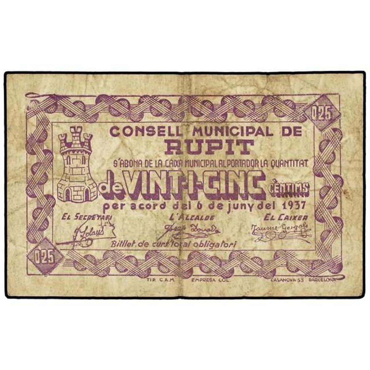 25 Cèntims. - 6 Junio 1937. - C.M. de RUPIT. - (Sucio). ESCASO. AT-2231;T-2572. MBC. - -